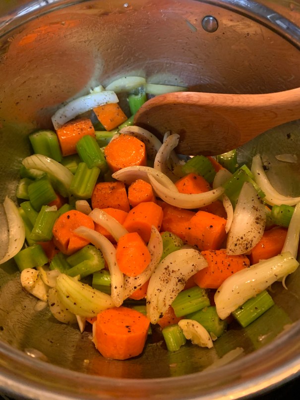 Heat olive oil in pot and Sauté Carrots, celery, onion, and garlic until onions are translucent.